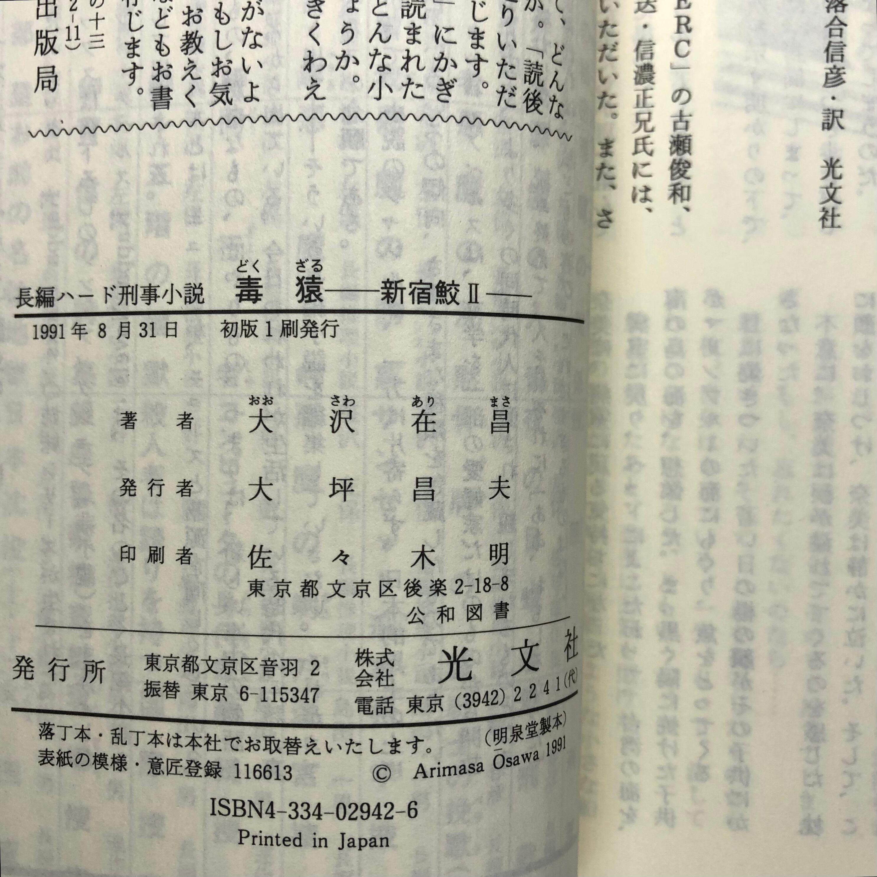 大沢在昌著 1991年8月31日初版 光文社 11×17×2センチ 全342ページ