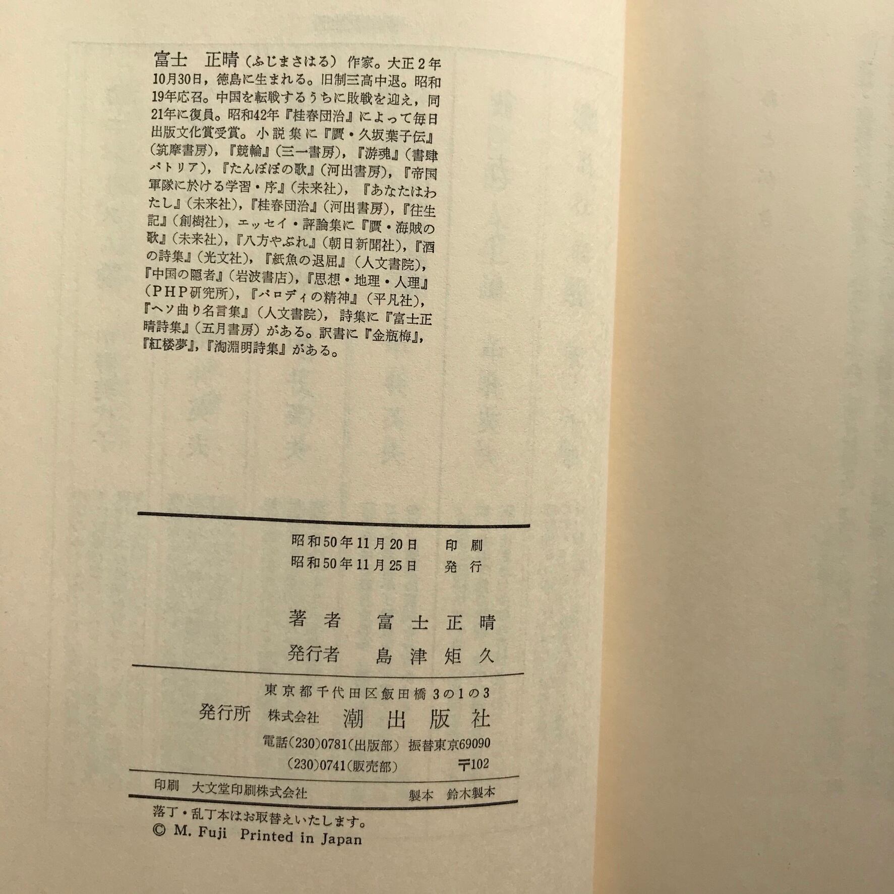 富士正晴著 昭和50年11月25日初版 潮出版社 全295頁 14×19.5×2.5センチ