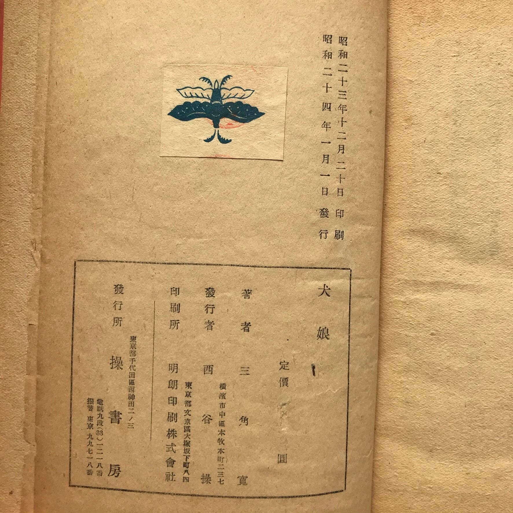 三角寛著 昭和24年1月1日初版 操書房 全241頁 12.5×18.5×1.5センチ