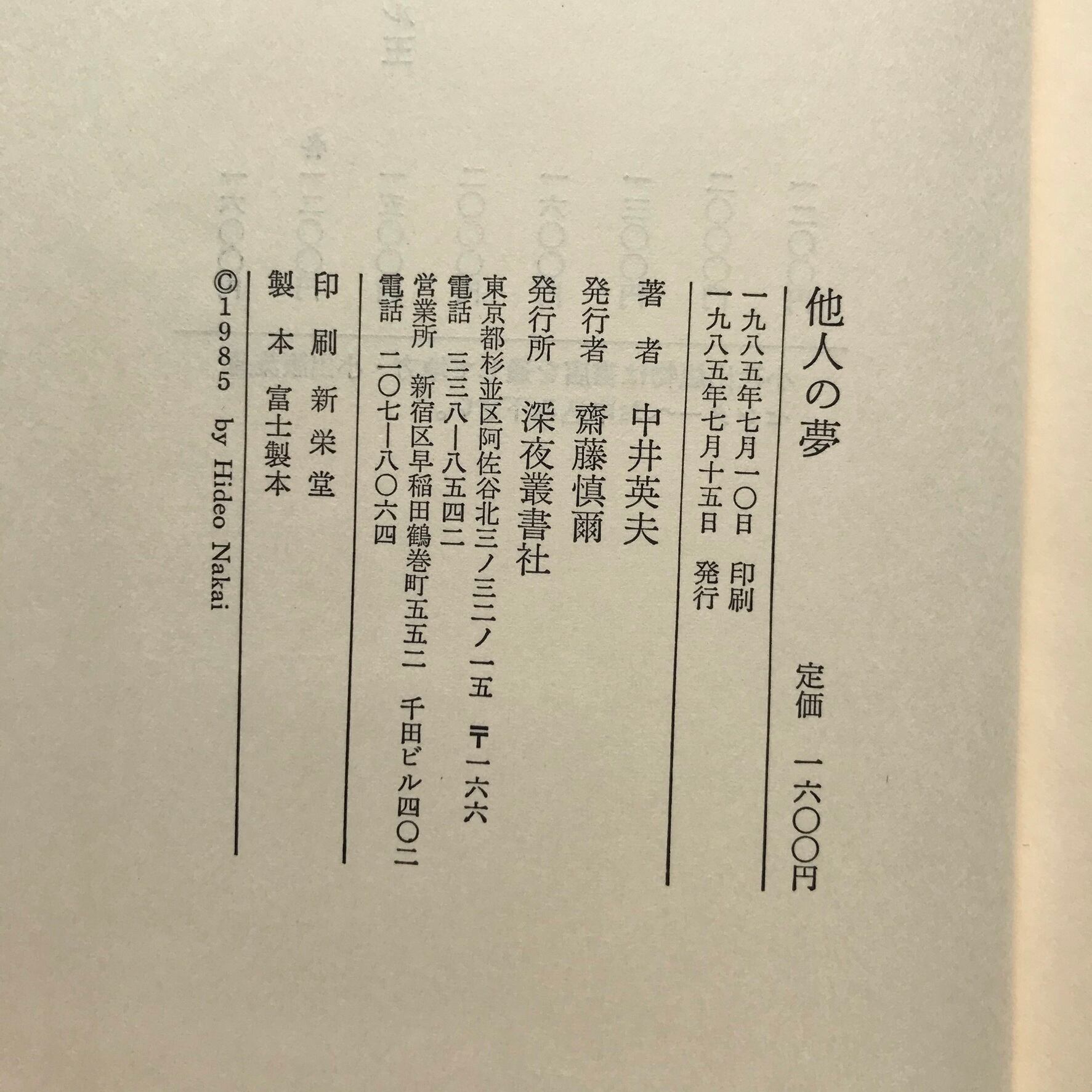 中井英夫著 1985年7月15日初版 深夜叢書社 全227頁 14×19.5×2センチ