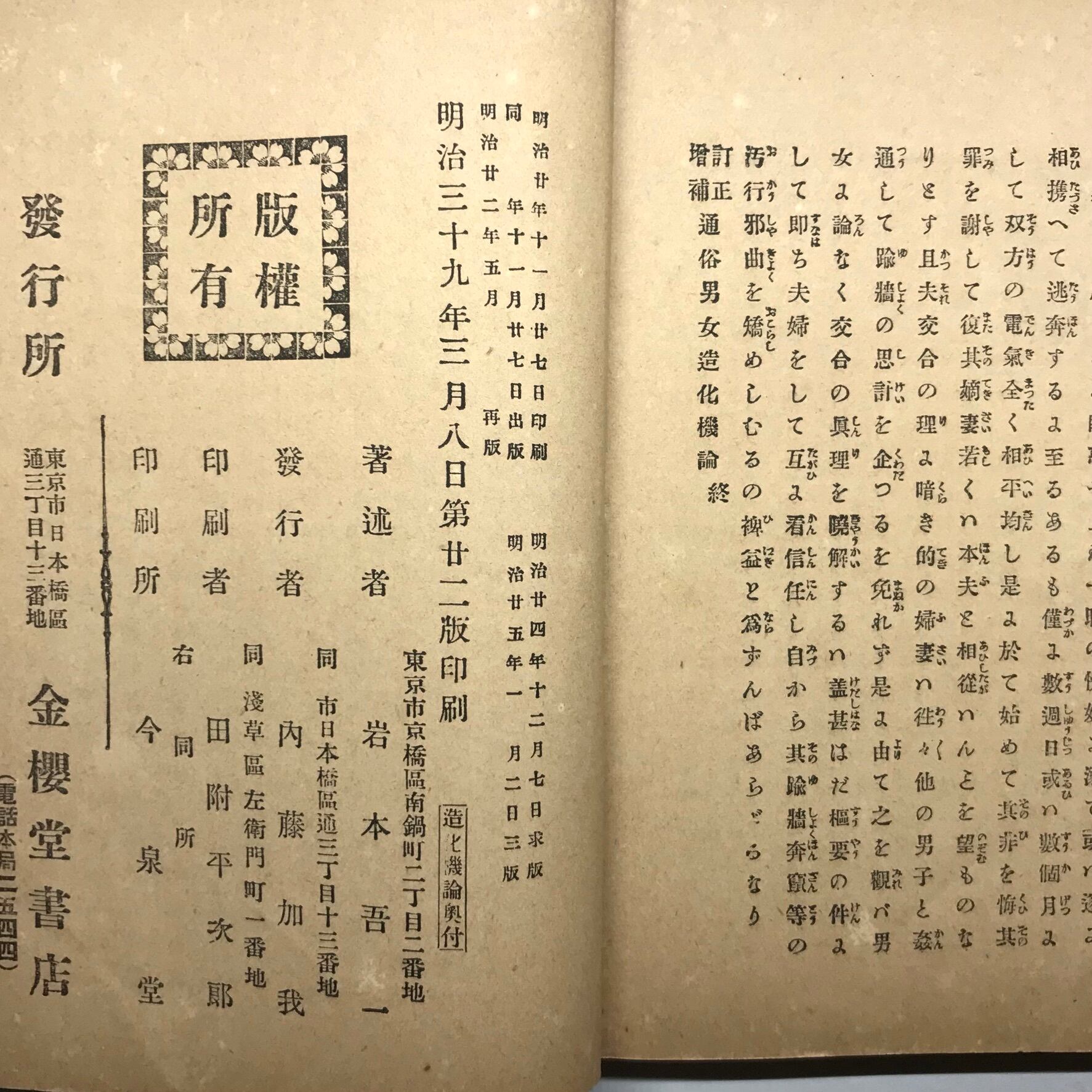 岩本吾一著 明治25年1月2日3版 金櫻堂書店 全184頁 13×19×1センチ