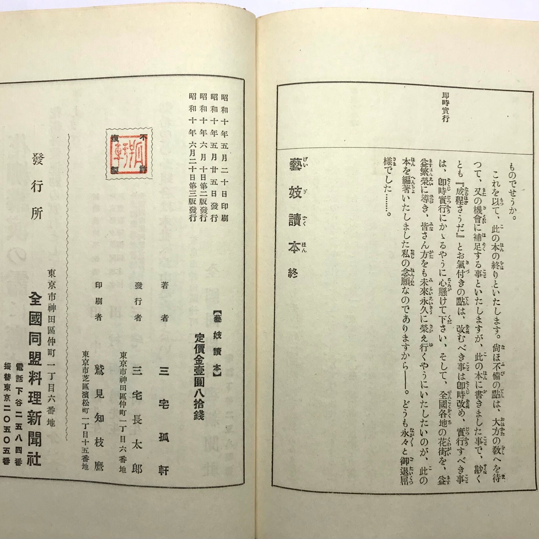 三宅孤軒著 昭和10年6月20日第3版。全国同盟料理新聞社 全360頁 14×20×2.5センチ