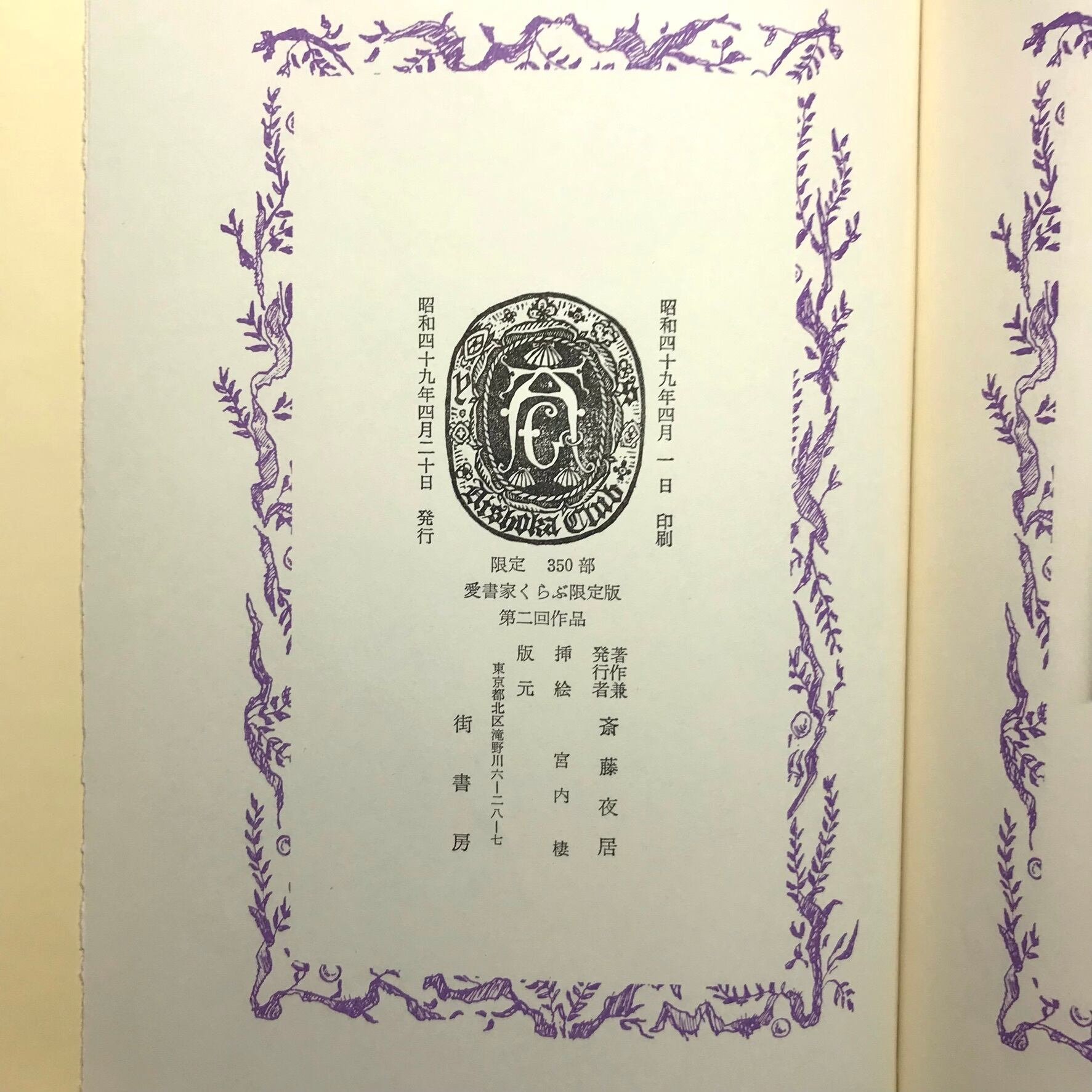 斎藤夜居著 昭和49年4月20日発行限定350部 街書房 全54頁 16.5×22.5×1.5センチ