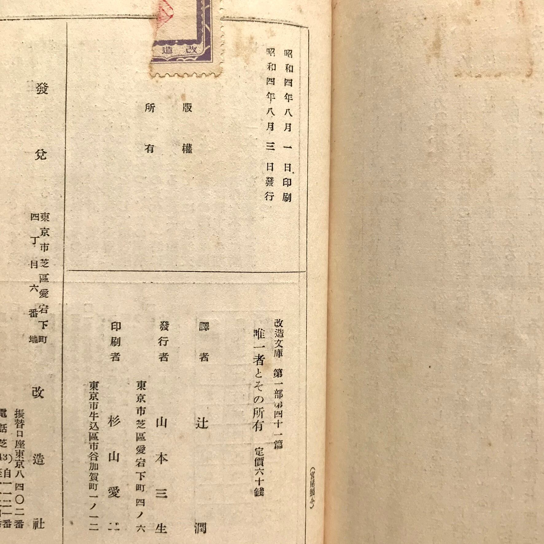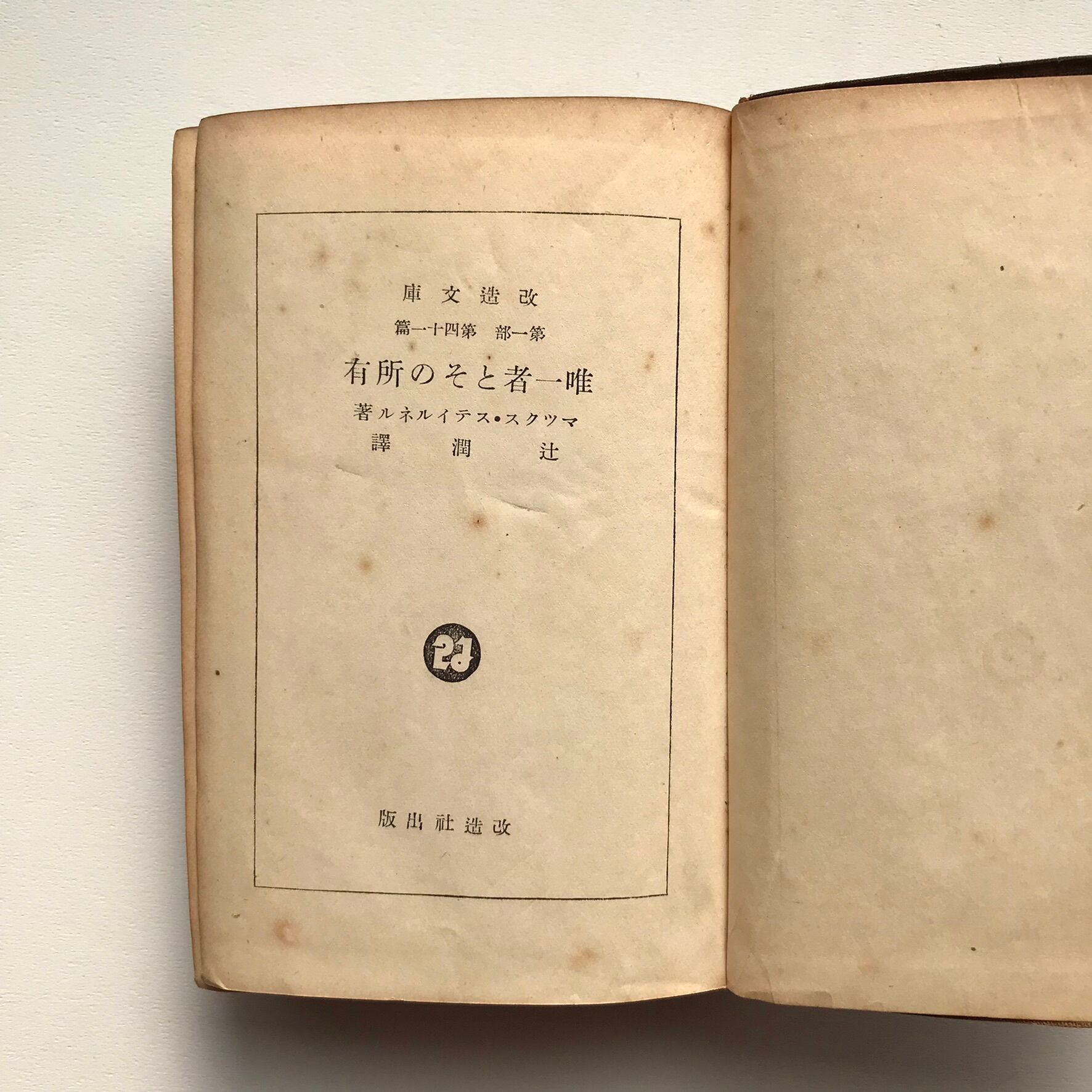 マックス・スティルネル著 辻潤訳 昭和4年8月3日初版 改造社 全551頁 10.5×15×2.8