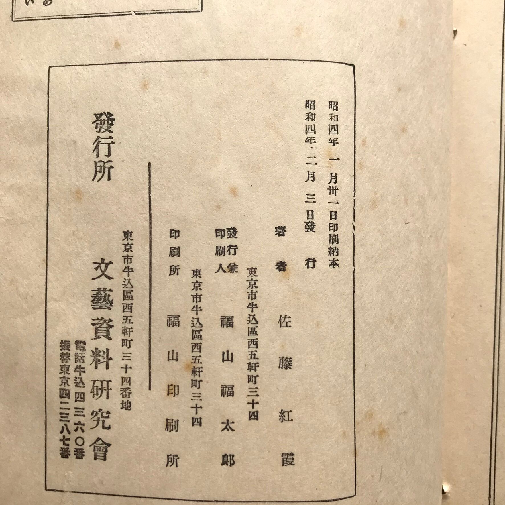 佐藤紅霞著 昭和4年2月3日発行 文藝資料研究会 全106頁 15×22×1.3センチ