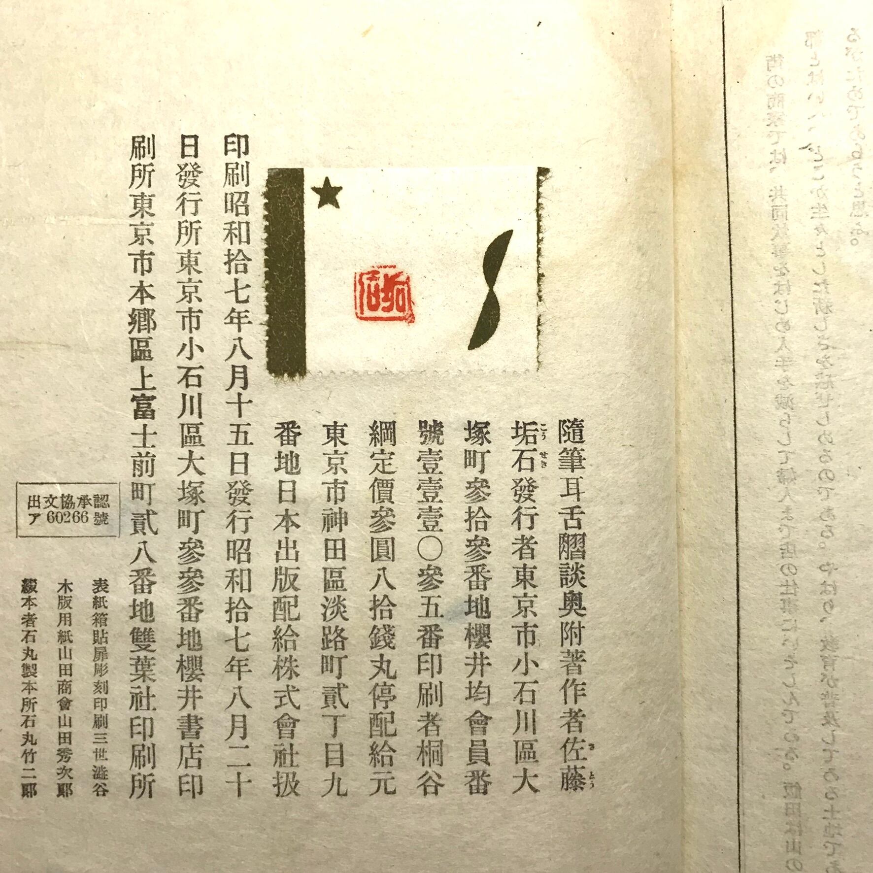 佐藤垢石著 昭和17年8月20日初版 櫻井書店 全154頁 15×21×1.2センチ