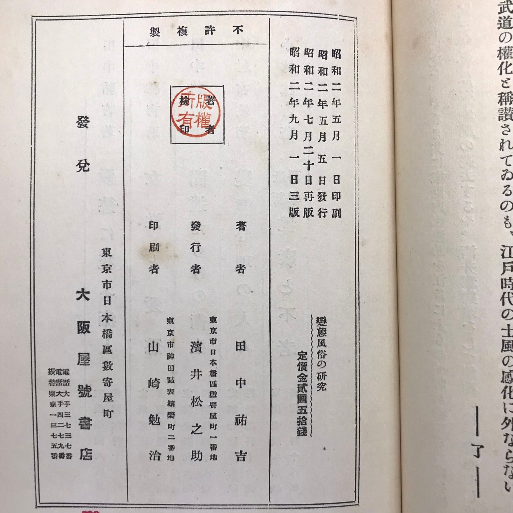 田中香涯著 昭和2年9月1日3版 大阪屋號書店 全358頁 13.5×20×2.3センチ