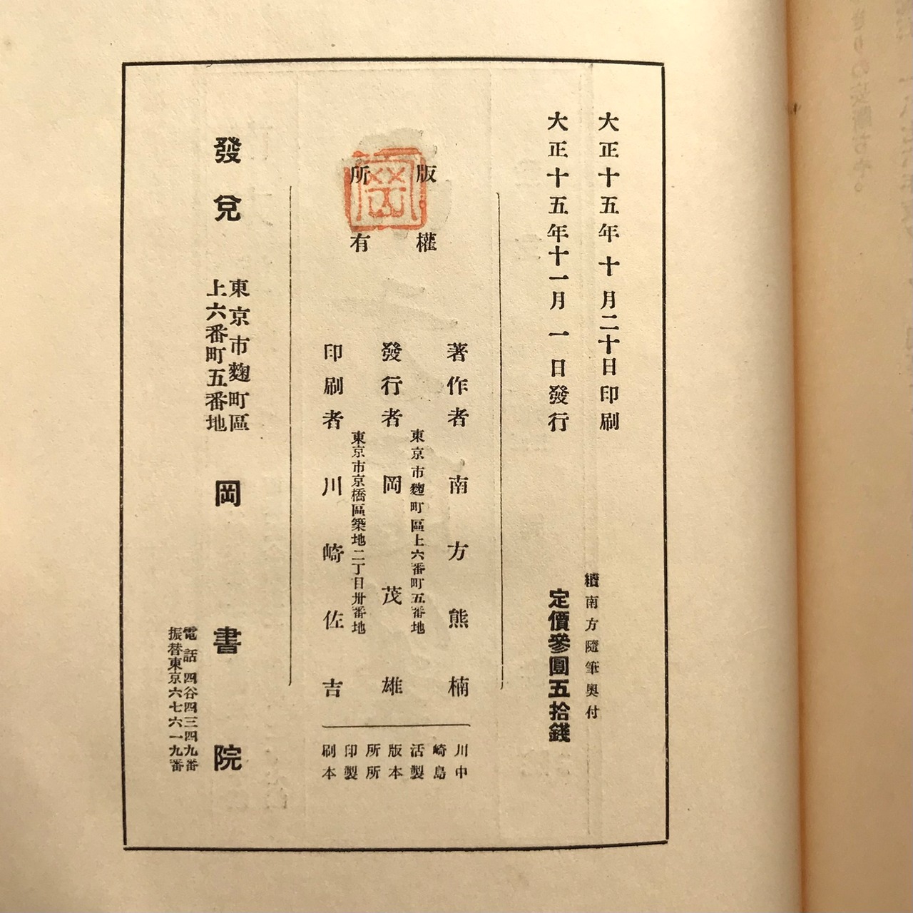 南方熊楠著 正:大正15年5月25日初版 岡書院 全468頁 14.5×20×3.5センチ