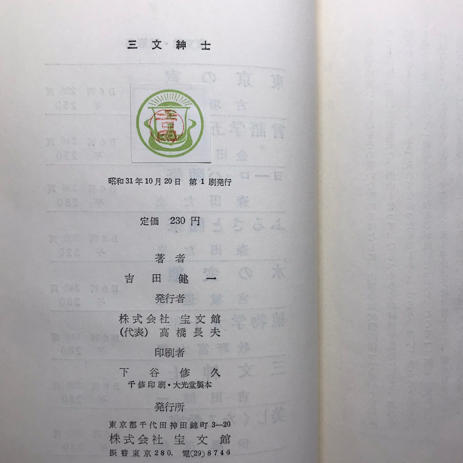 吉田健一著 昭和31年10月20日初版 宝文館 全221頁 13.5×19×1.9センチ