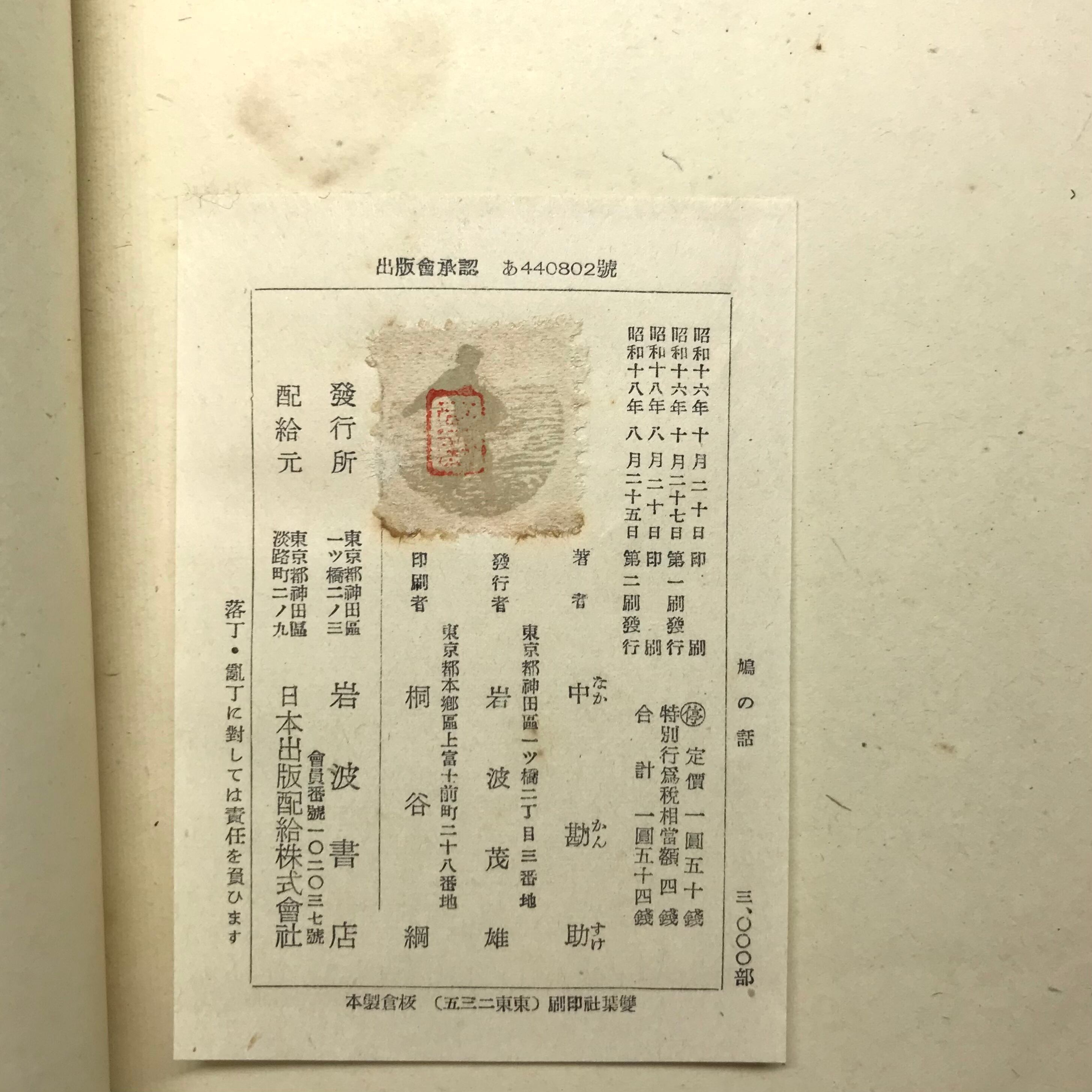 中勘助著 昭和18年8月25日第2刷 岩波書店 全213頁 13×18.5×1センチ